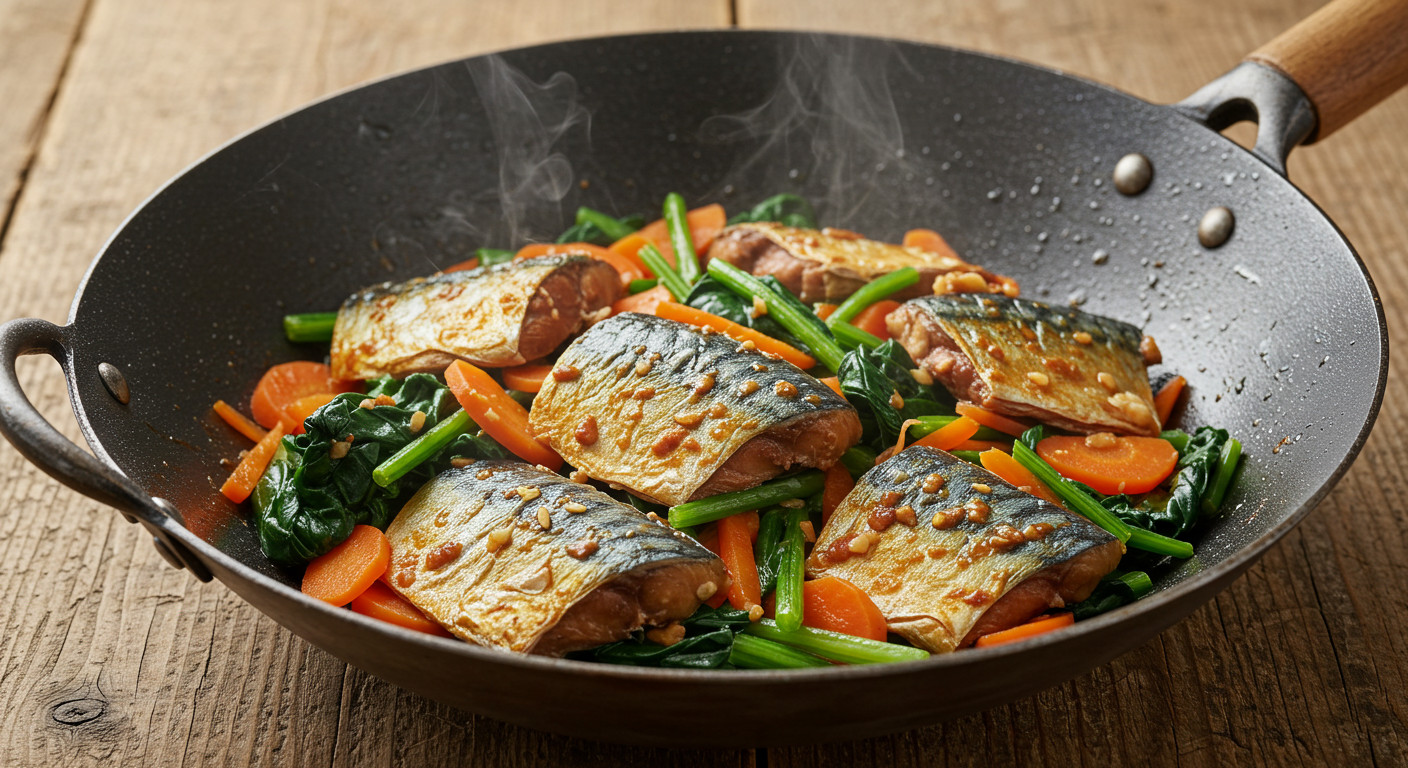 ① サバとほうれん草の味噌炒め